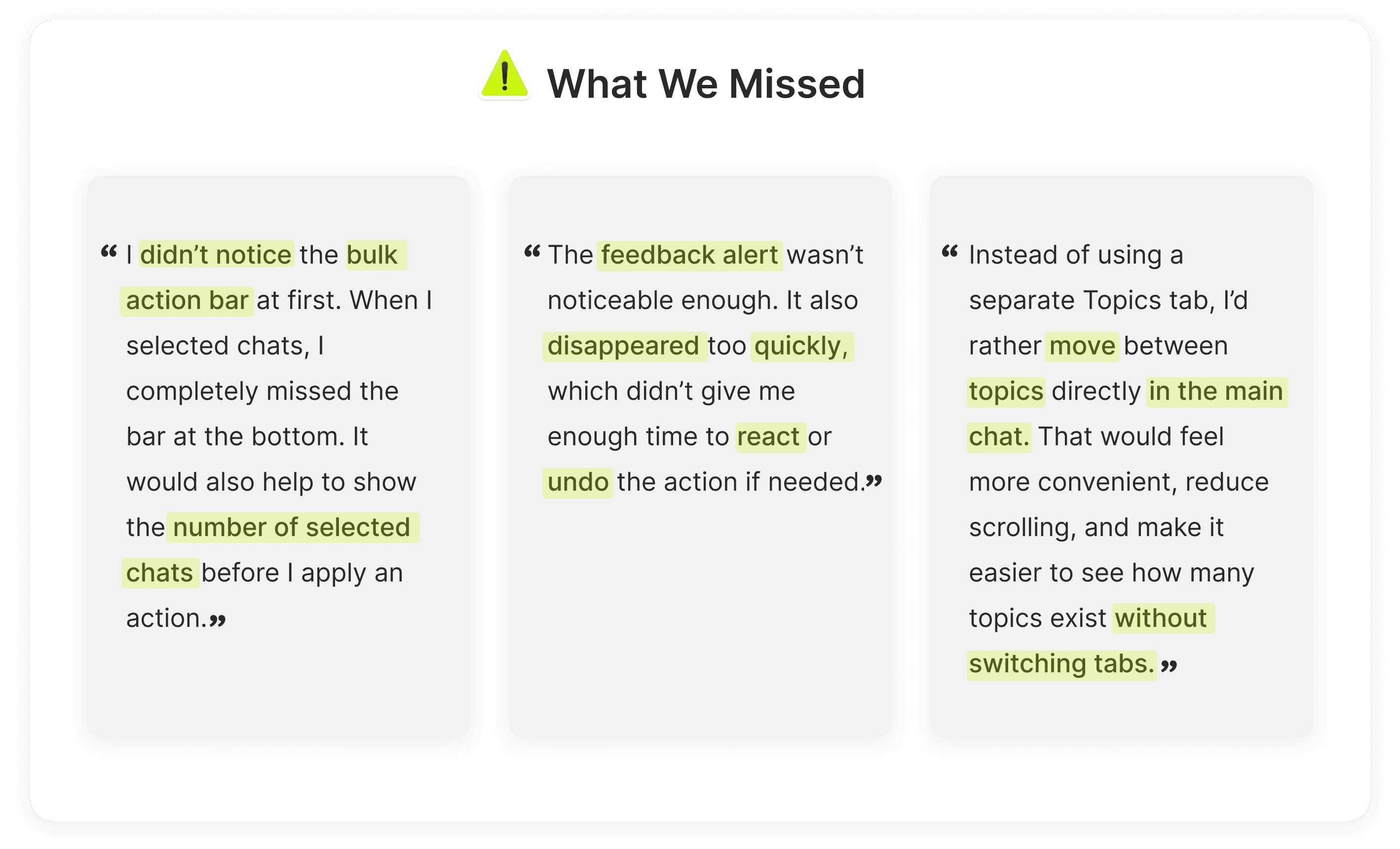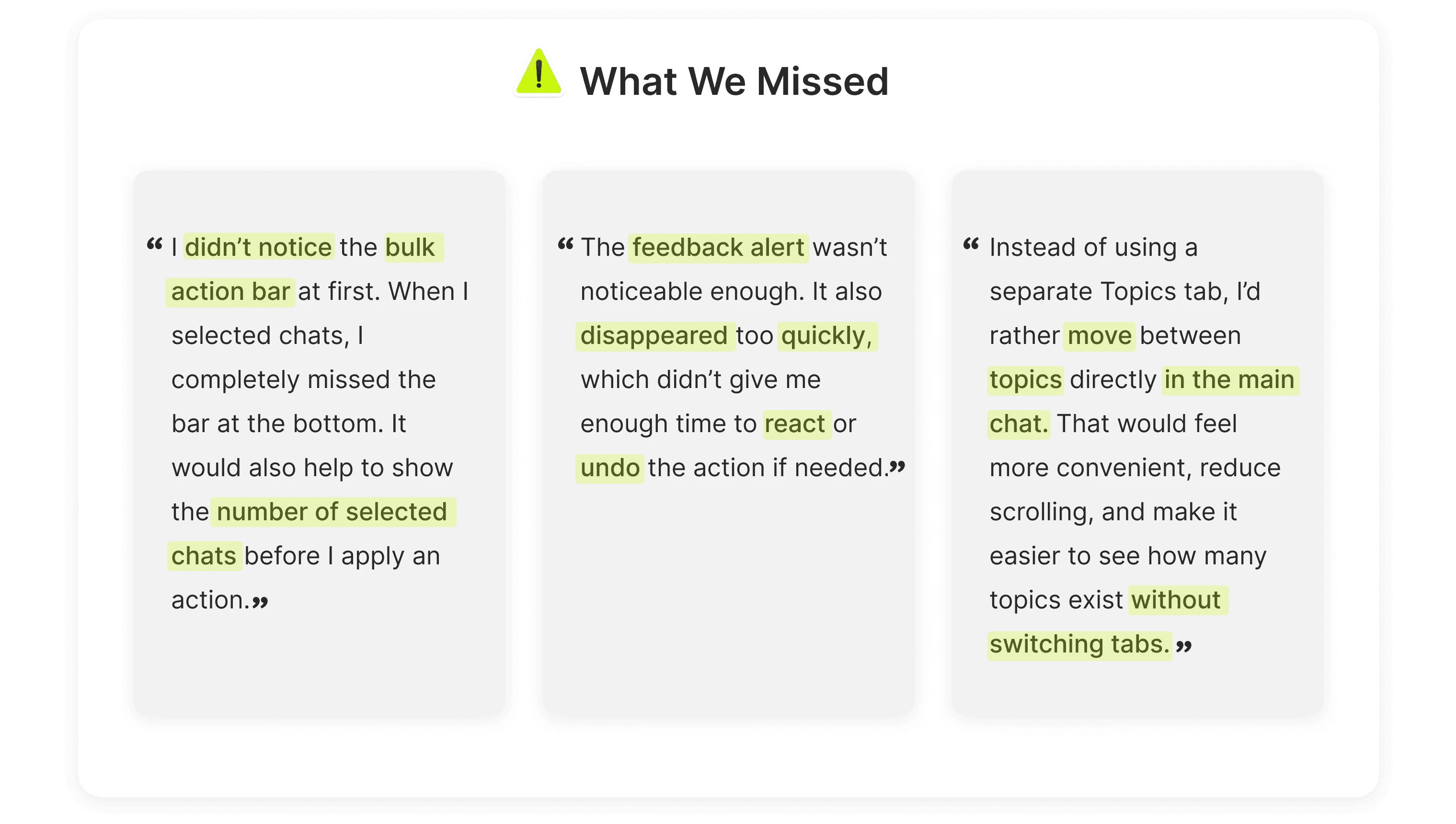 Users often missed the bulk action bar after selecting multiple chats and wanted clearer visibility into how many items were selected before taking action. We explored three variations, and the third was selected because users responded to it most positively and found both the selection count and available actions easier to notice.