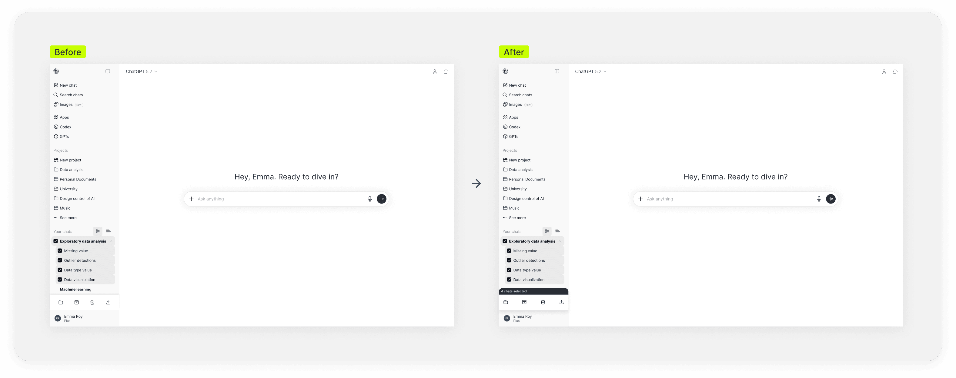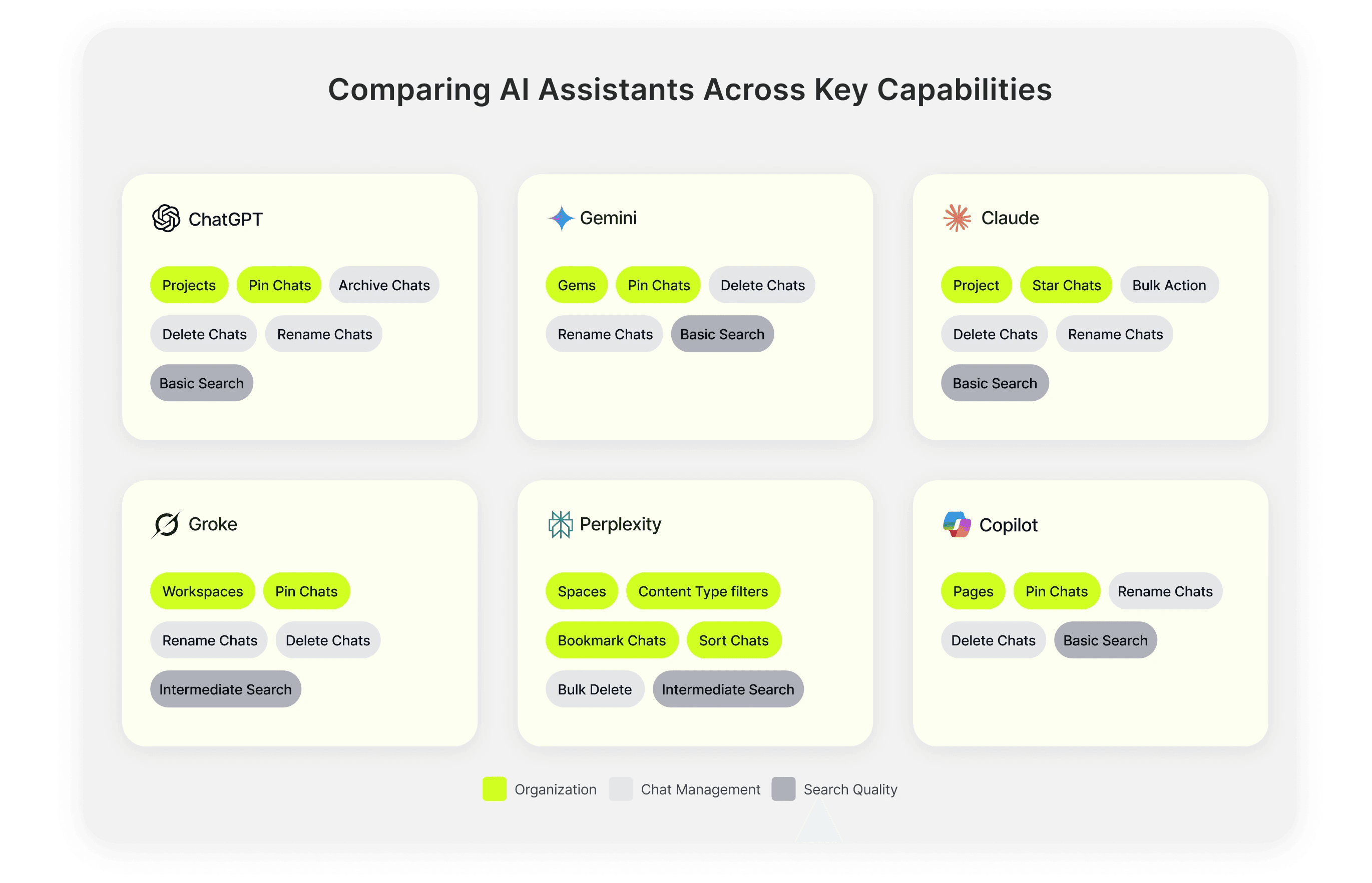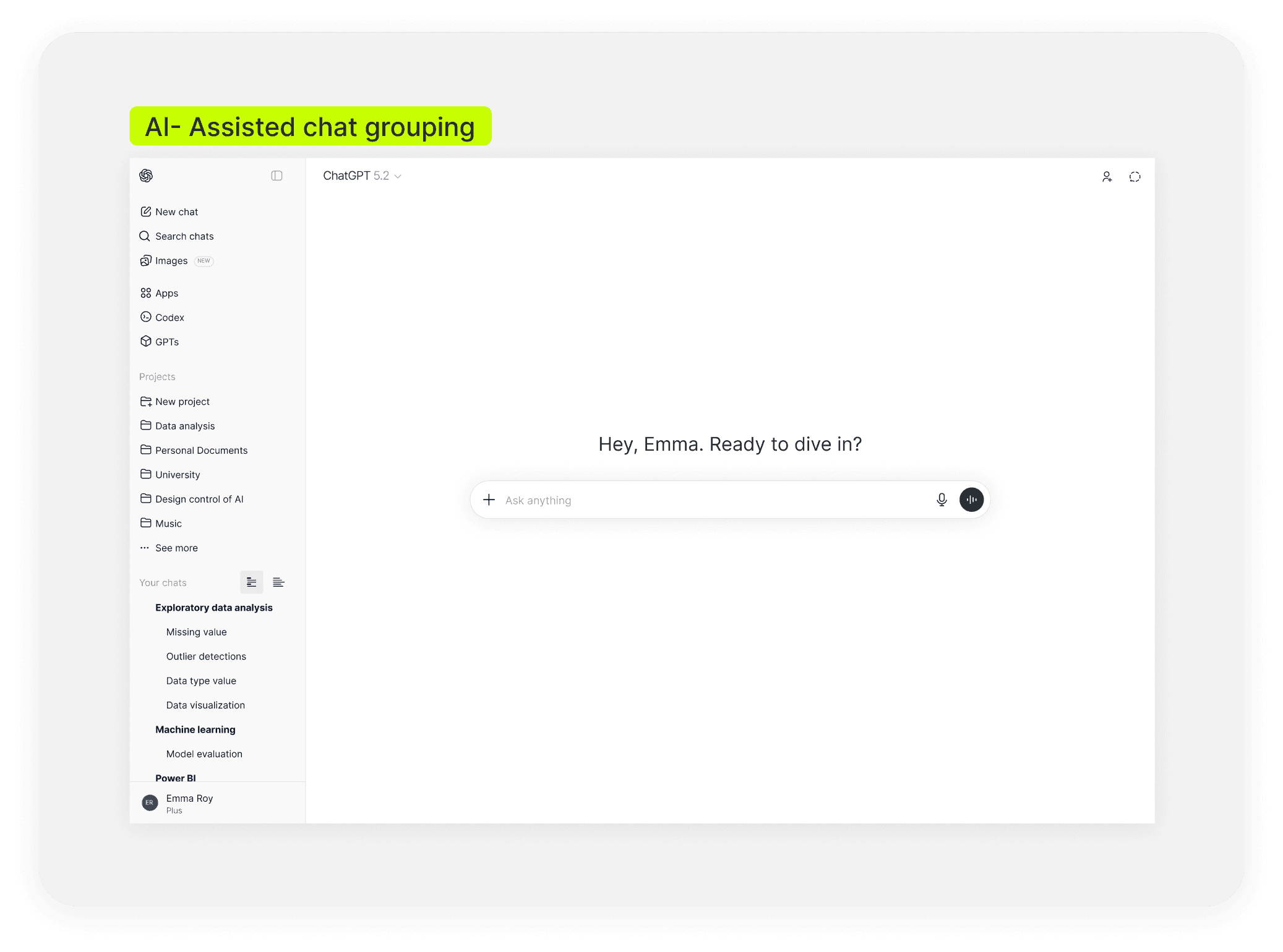 Helps users organize chat history with AI-generated groups they can rename, switch views quickly, and take action on multiple chats without breaking flow.