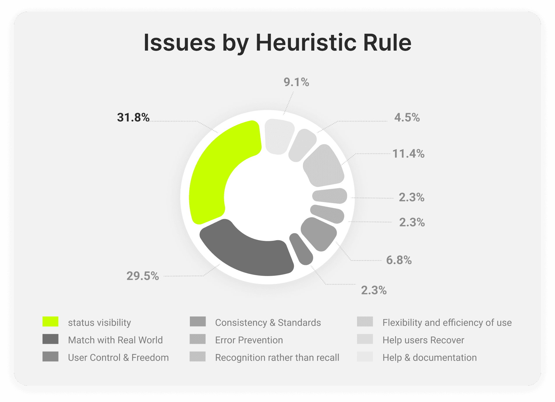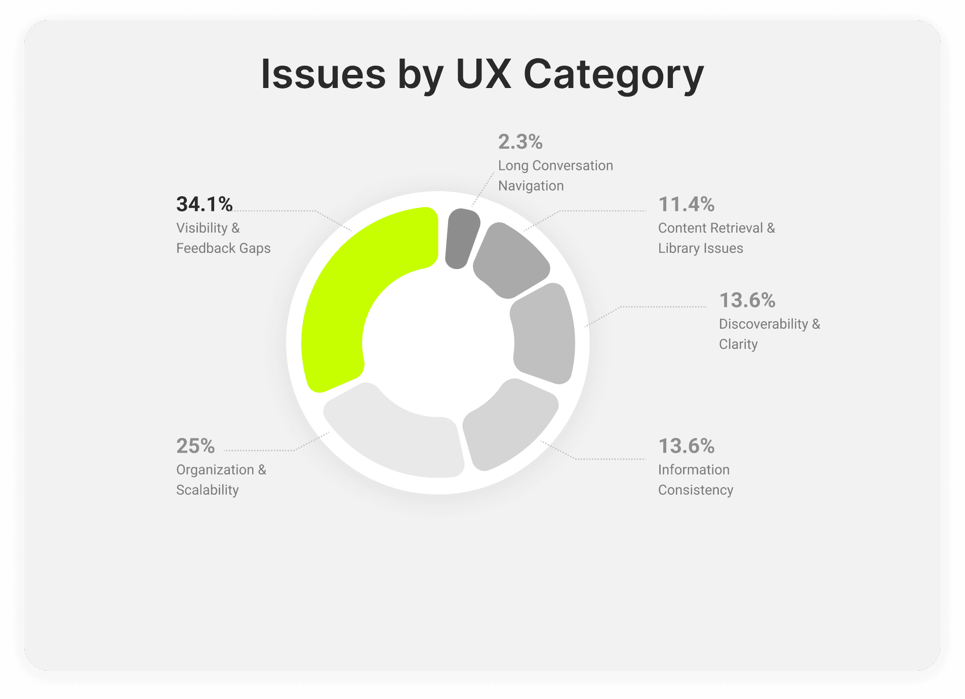 Our heuristic evaluation showed that most of the identified violations were major or critical. The largest concentration of issues fell under visibility and feedback gaps, with organization and scalability emerging as the second most significant UX category. This indicates that although organization is not ChatGPT’s primary pain point, it is still a substantial challenge especially as chat histories grow and become harder to manage over time.