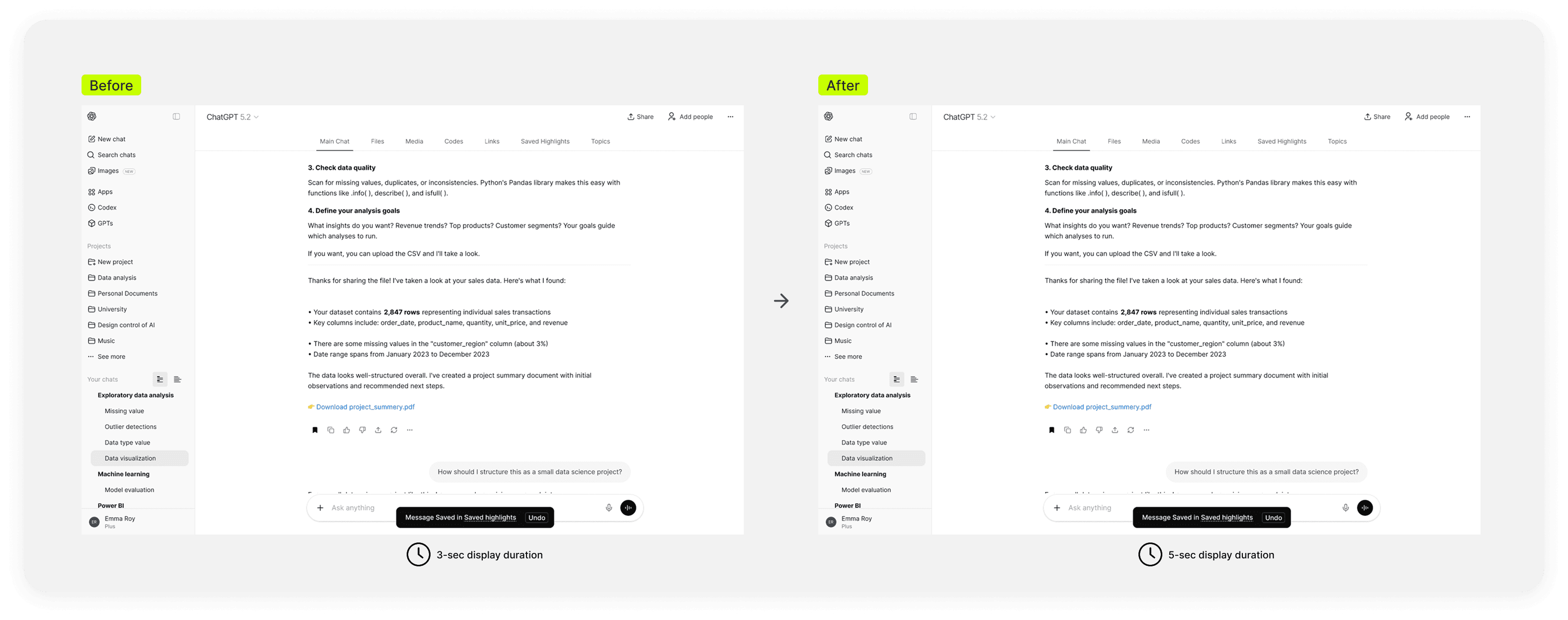 Keeps saved highlights connected to where they came from and makes topic shifts easier to follow within and across chats.