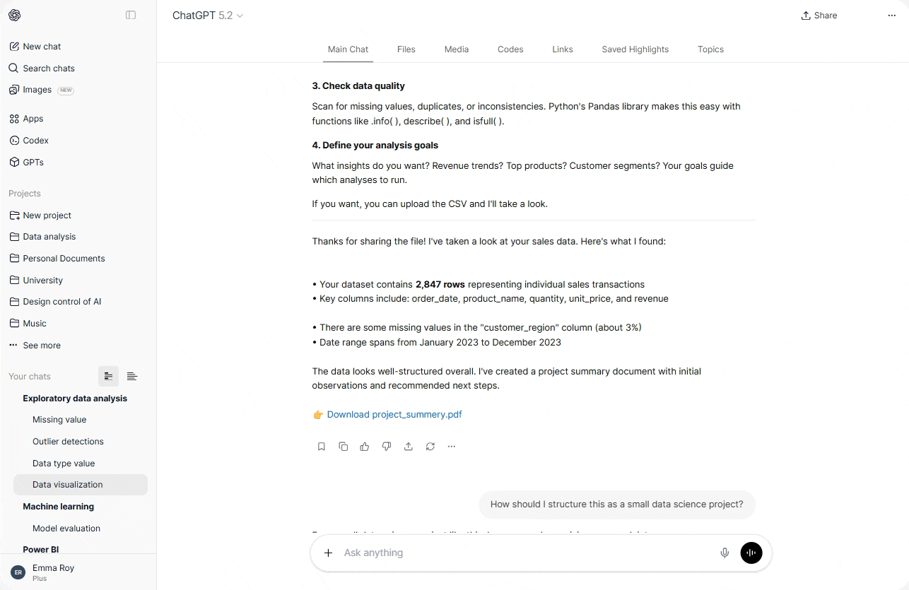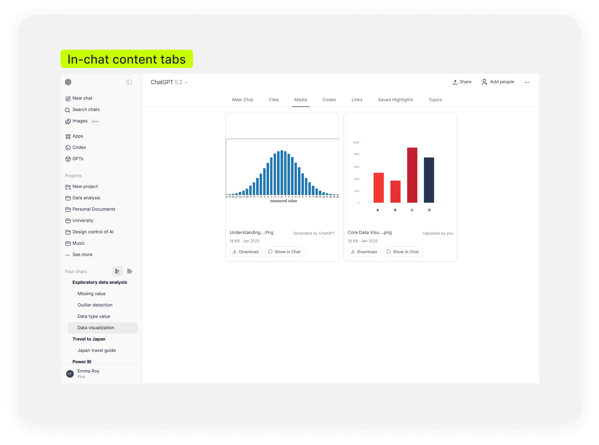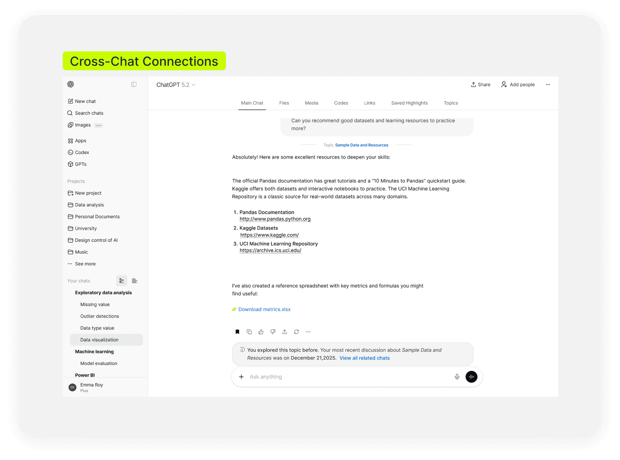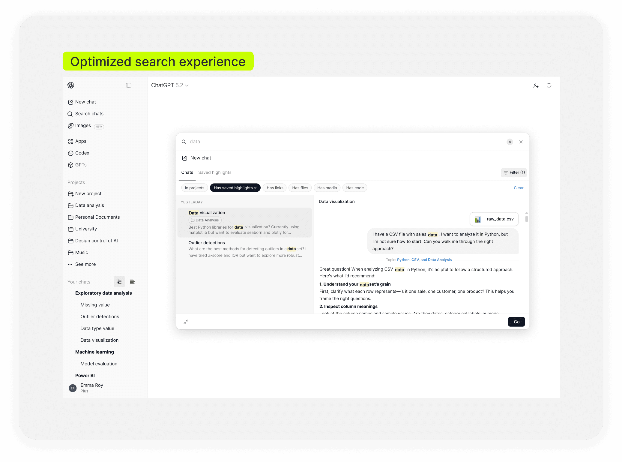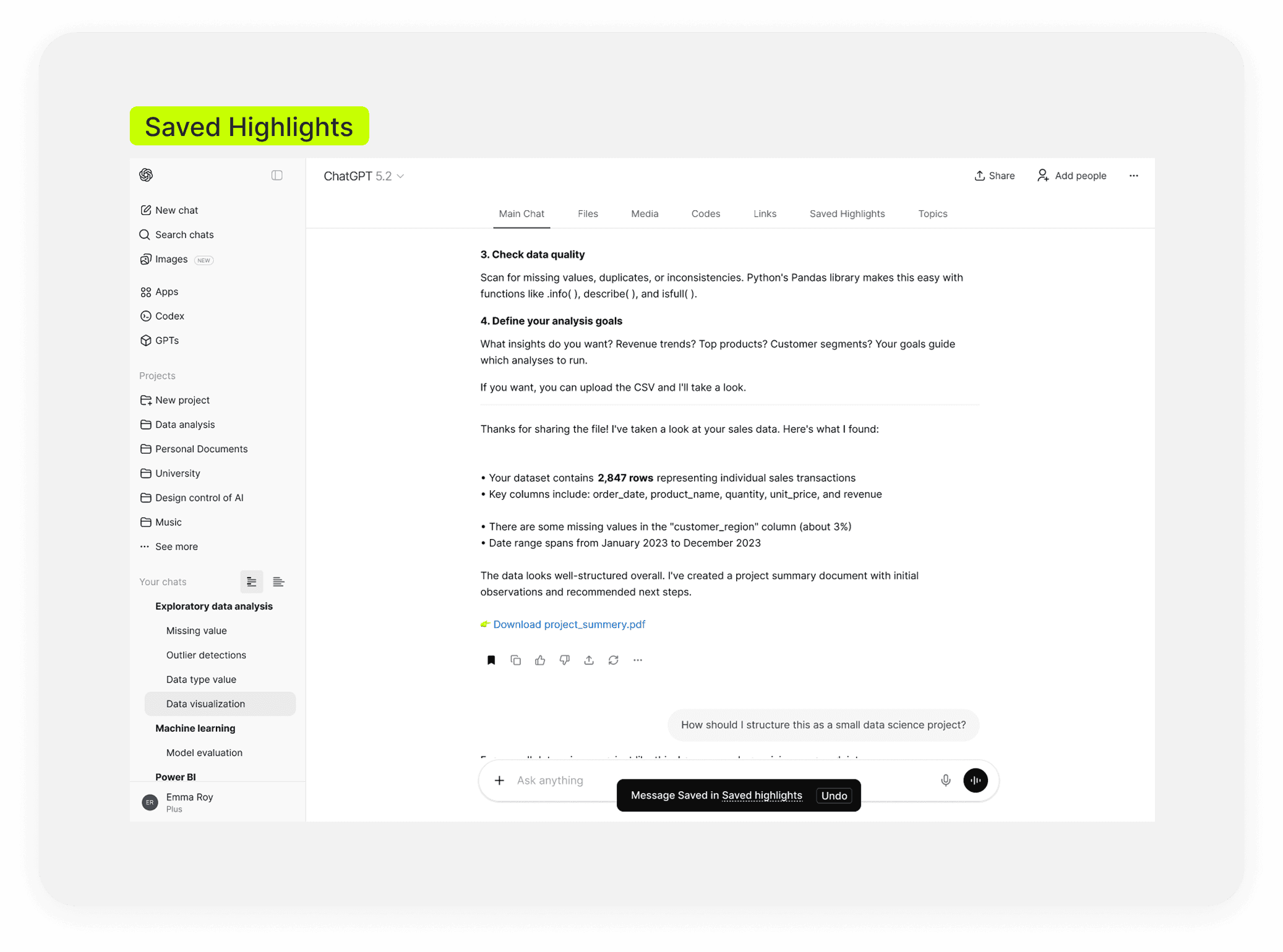 Save useful outputs and reconnect related conversations, so valuable work is easier to revisit and build on over time. This includes Saved highlights and cross-chat connections.