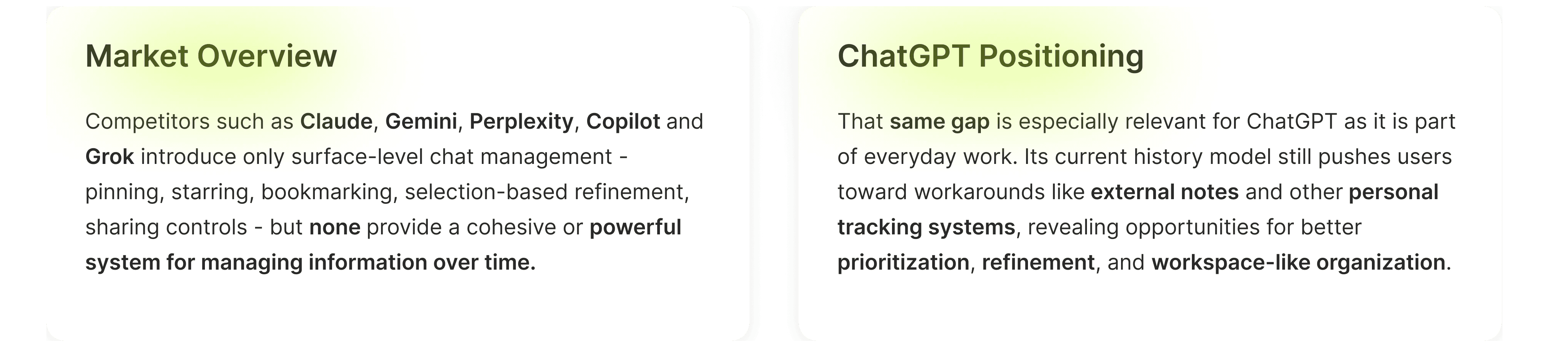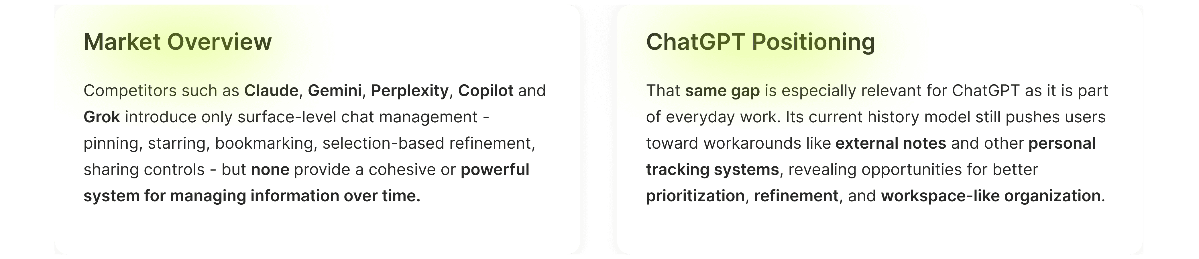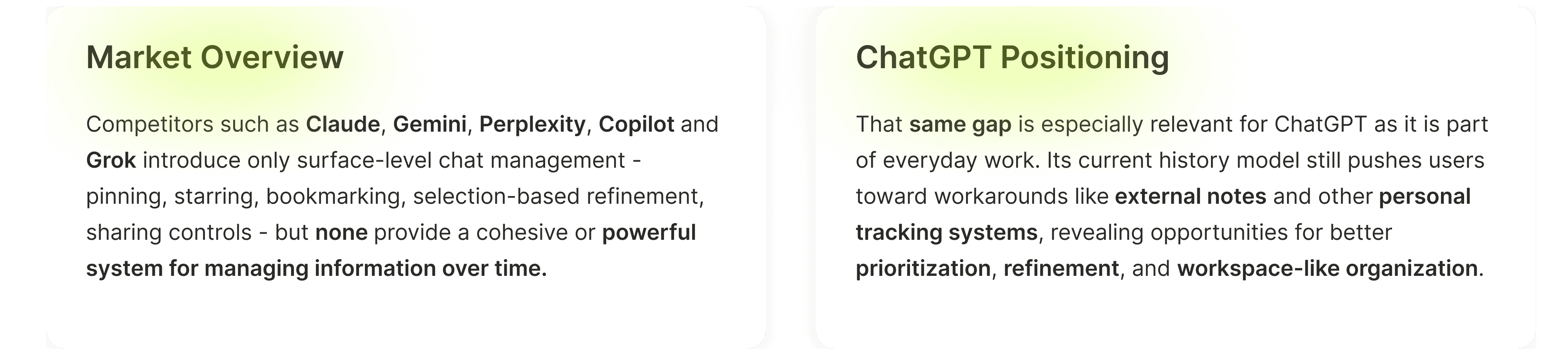 Desk research made one thing clear: as ChatGPT scales, users need better ways to organize, reuse, and retrieve past conversations over time.
