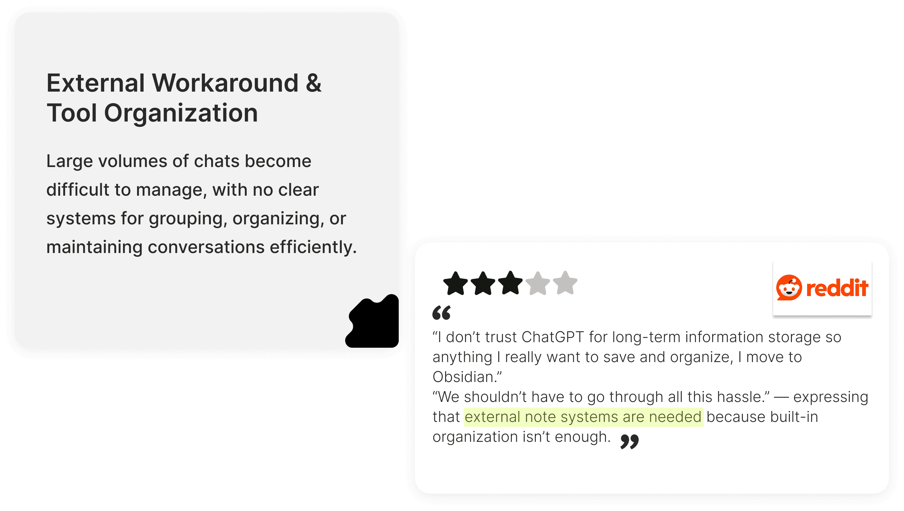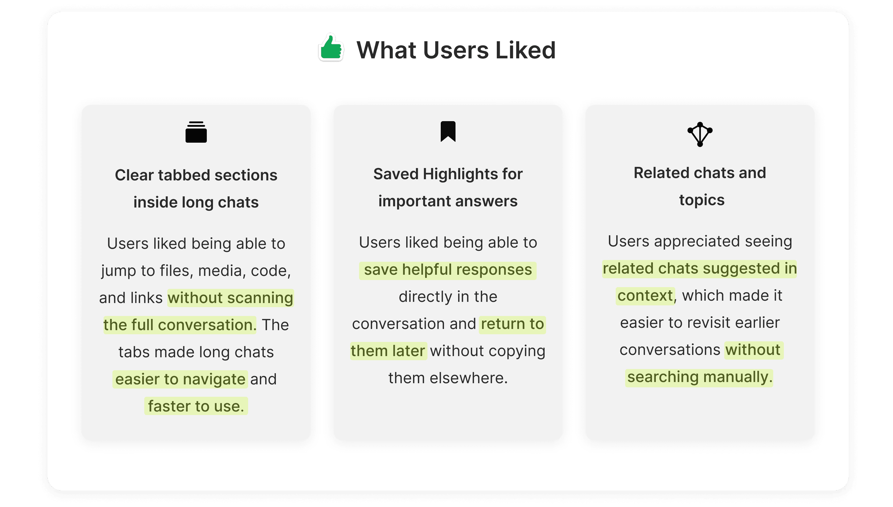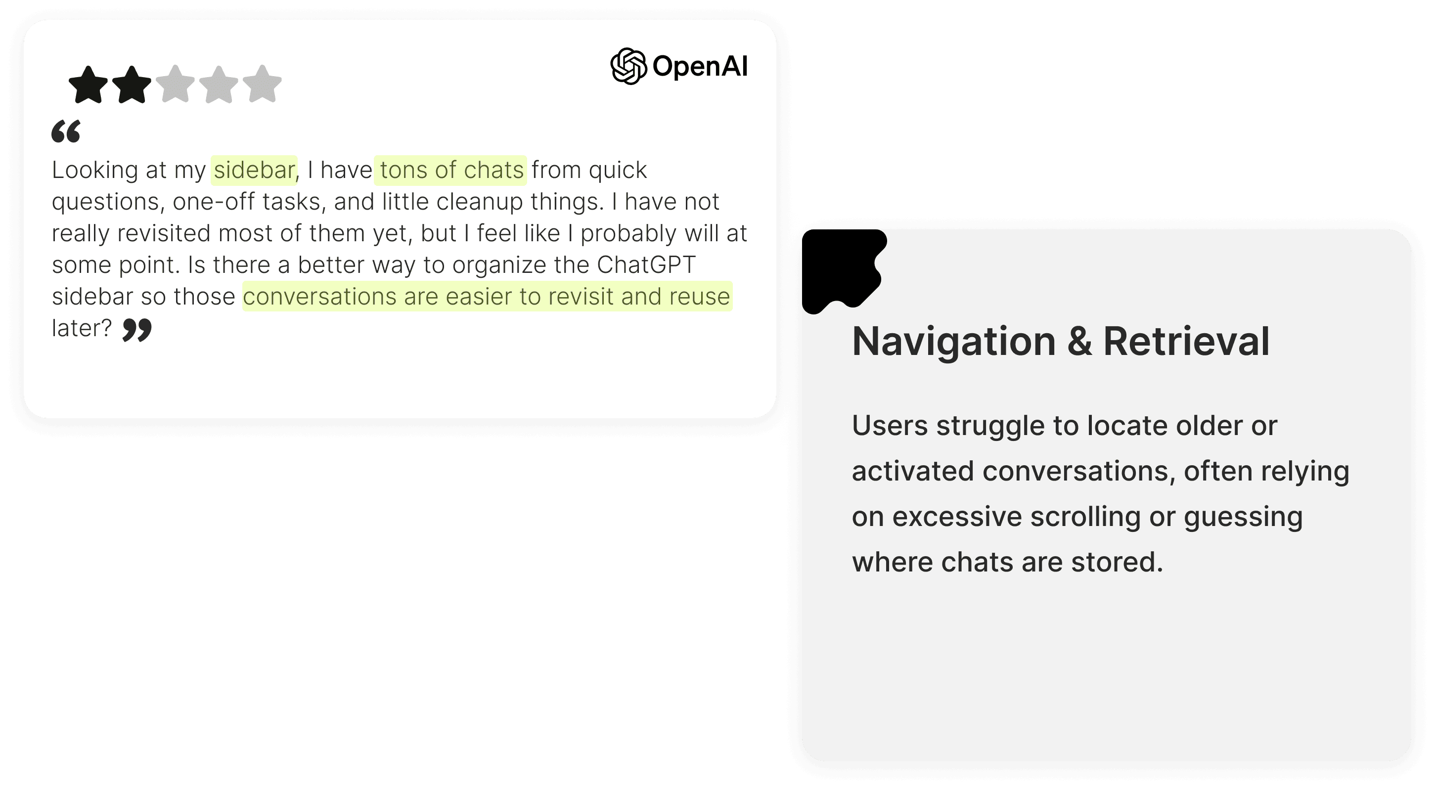 Desk research made one thing clear: as ChatGPT scales, users need better ways to organize, reuse, and retrieve past conversations over time.