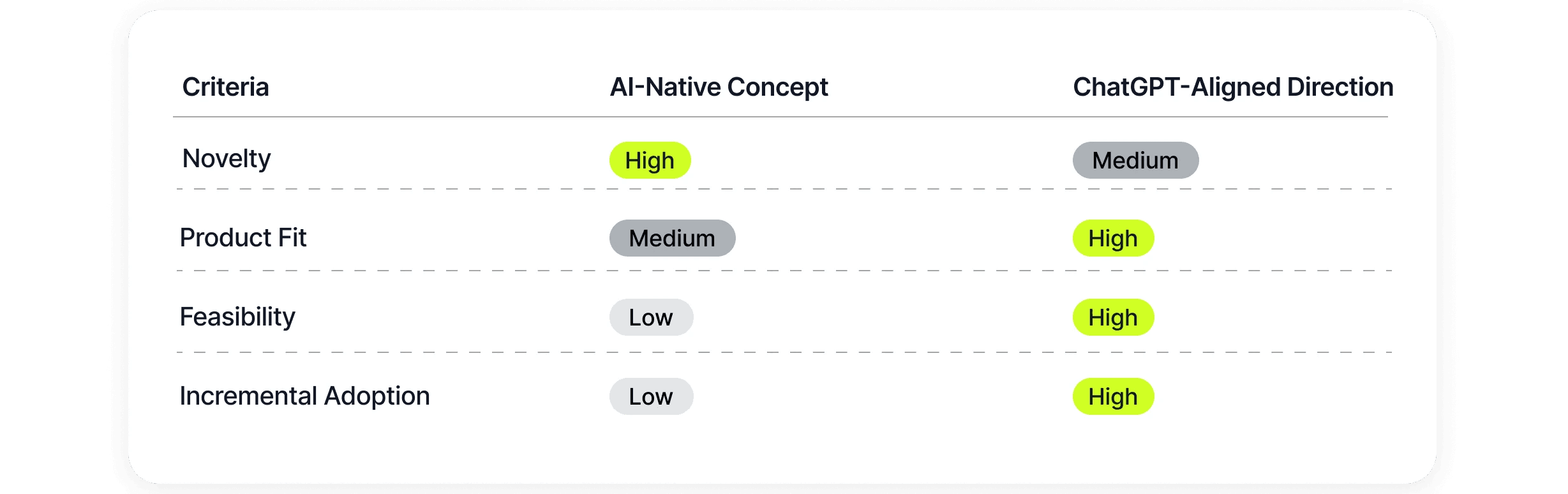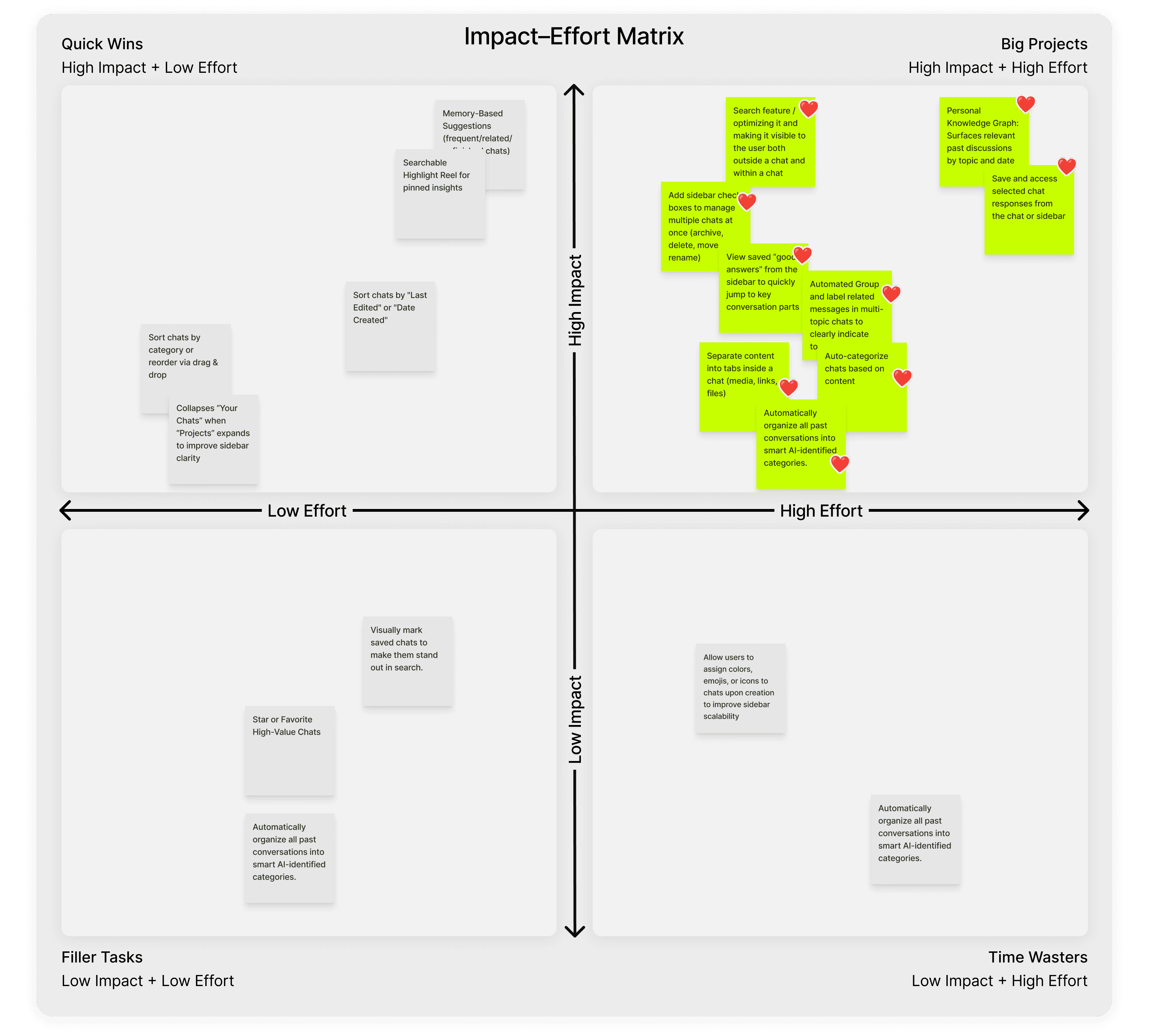 Using an impact–effort matrix and a desirability, viability, and feasibility evaluation, we prioritized solutions that solve real user pain points and differentiate ChatGPT within the AI assistant landscape.