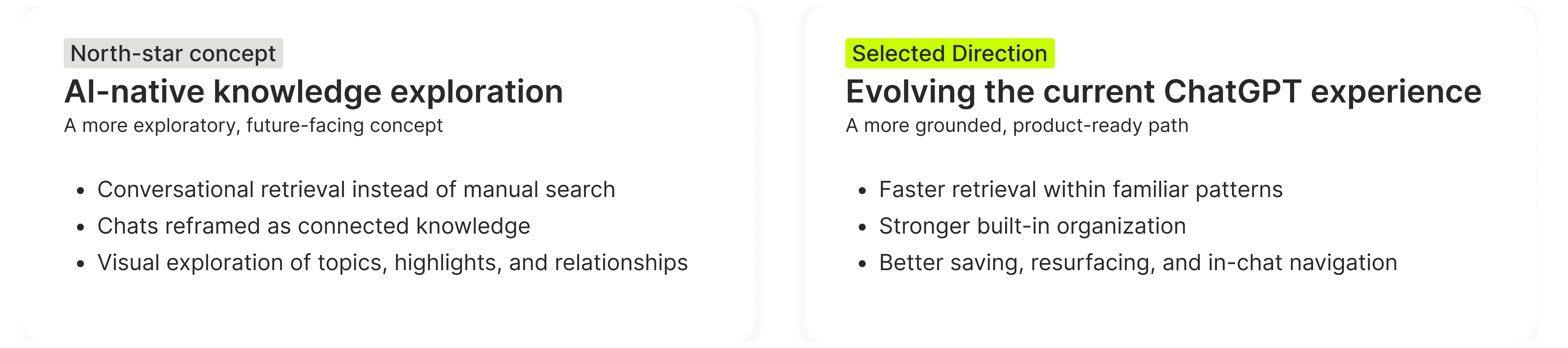 After identifying the opportunity areas, two possible directions were explored. One was a more ambitious AI-native concept that reimagined conversations as a connected knowledge system. The other focused on evolving the current ChatGPT experience in a more grounded, product-ready way.