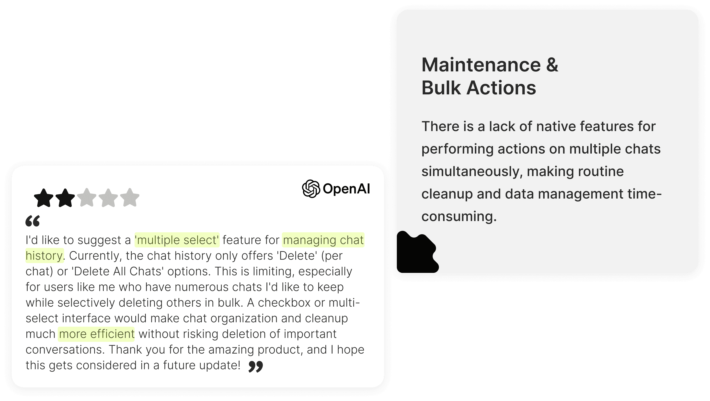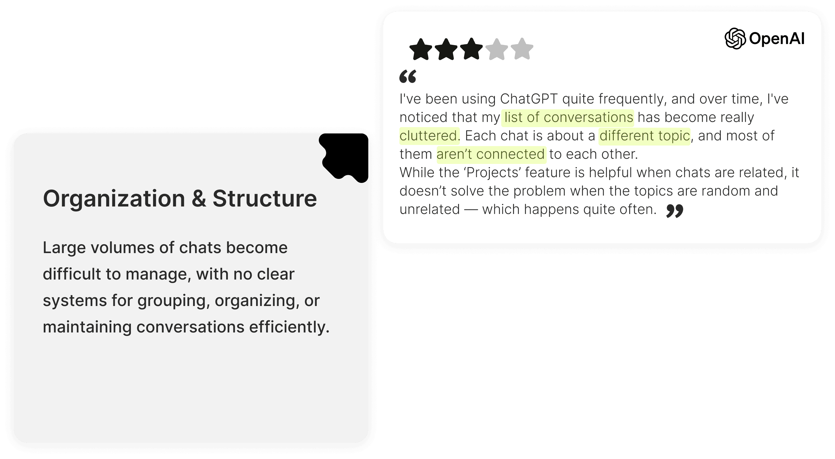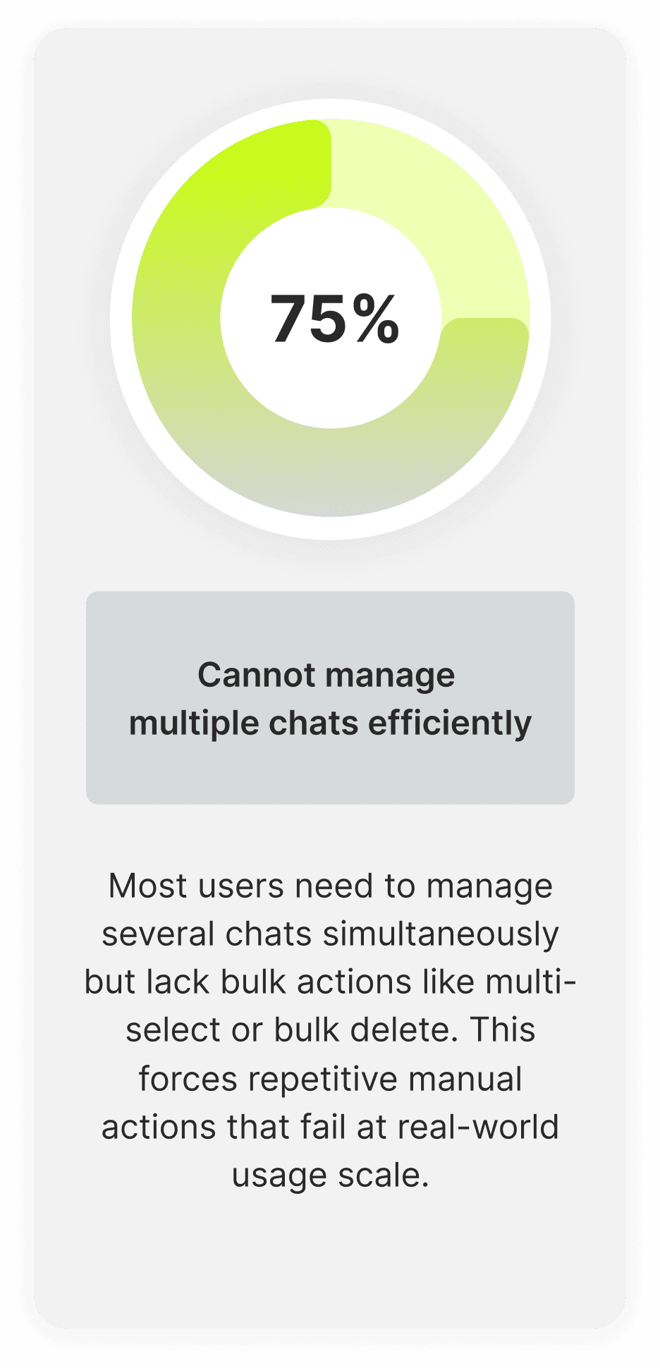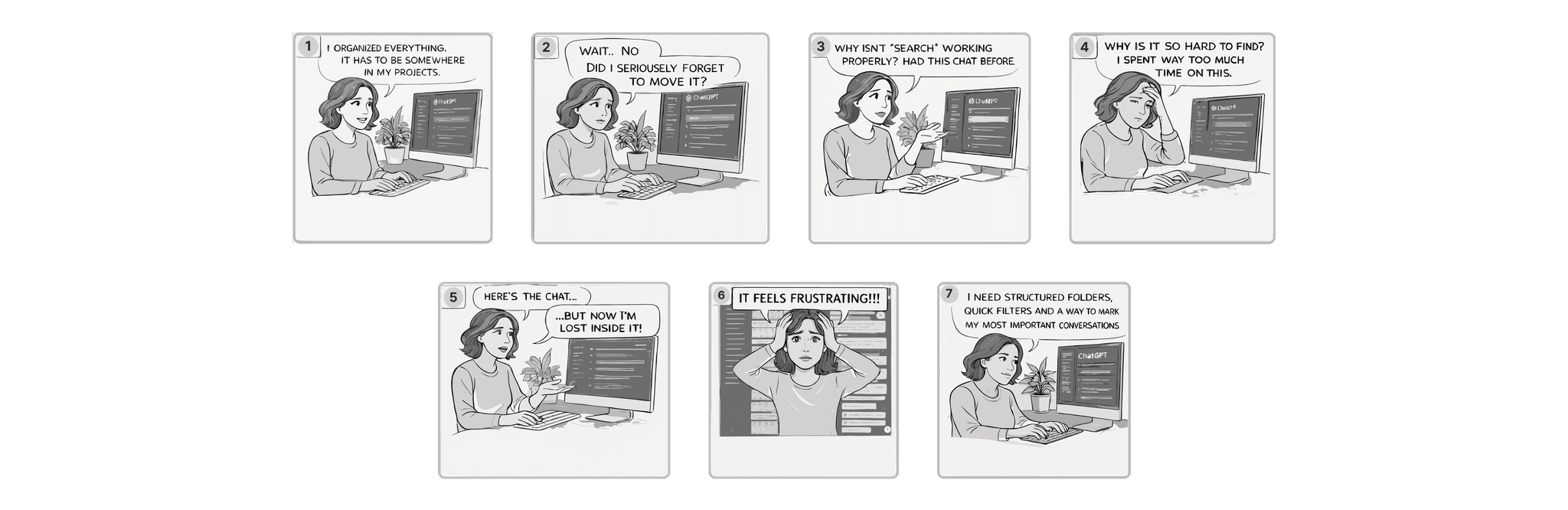 As chat volume grows, users lose visibility, control, and confidence in ChatGPT’s history system. Research shows that users struggle to recognize, locate, and manage past conversations, especially across multiple chats, creating frustration, repeated work, and broken workflows. This revealed a need to better organize conversations, reuse valuable content, and retrieve past work faster.