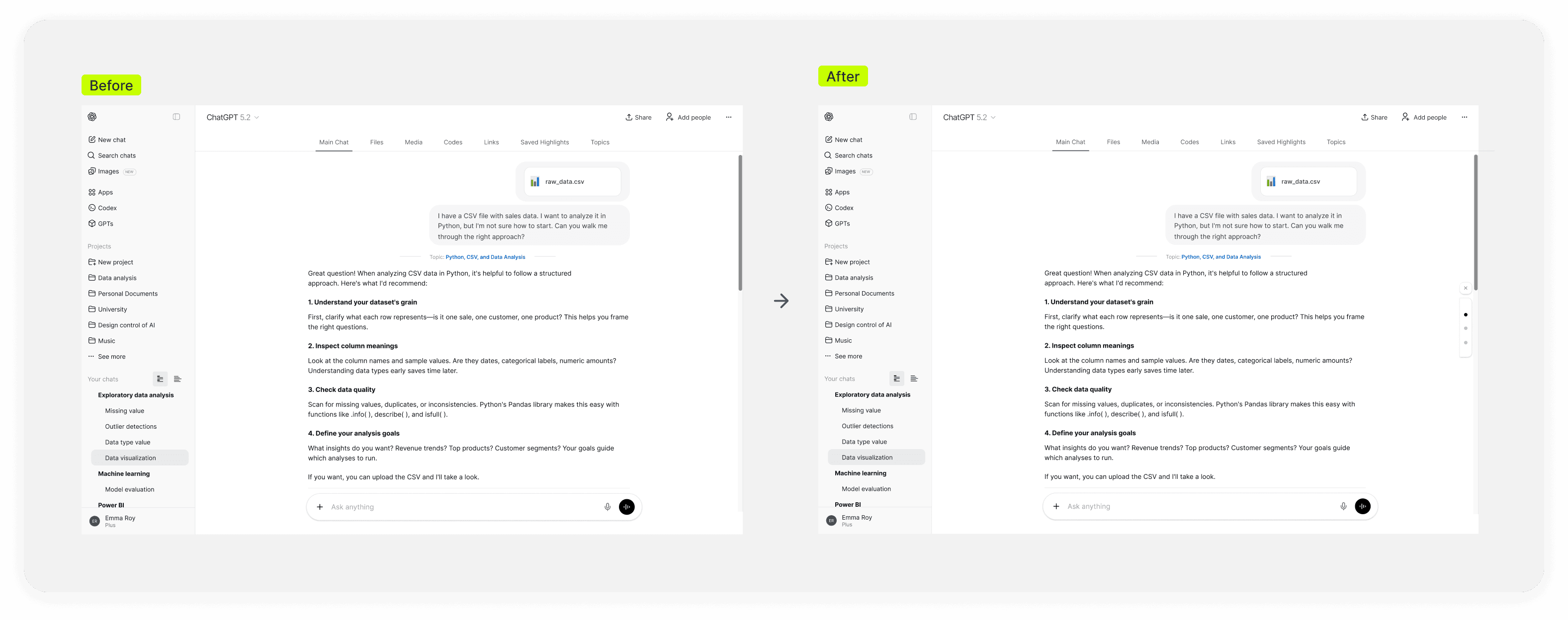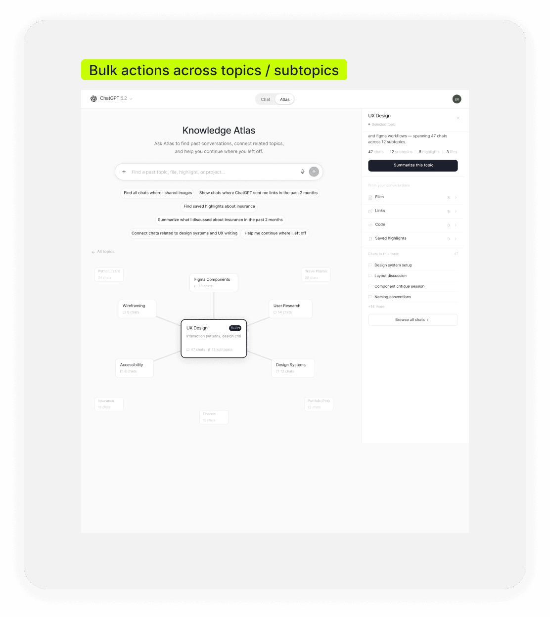 We redesigned ChatGPT’s conversation history around three connected goals: Organize, Retrieve, and Reuse. The redesign helps users structure chats in the sidebar and within long conversations, find past work faster through content tabs and improved search and save and reconnect valuable content across chats. Together, these changes turn chat history from a growing list into a system users can revisit, build on, and act on with confidence.