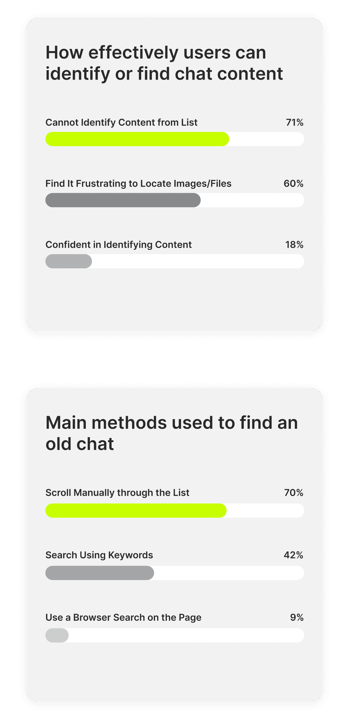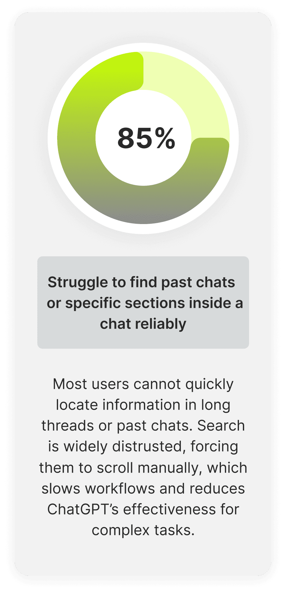 Survey results from 100+ ChatGPT users showed that retrieving past chats still depends heavily on manual scrolling. Rather than using a scalable system for revisiting previous conversations, most users rely on slow, fragile methods like scrolling through history or basic search making past content harder to access, manage, and reuse over time.