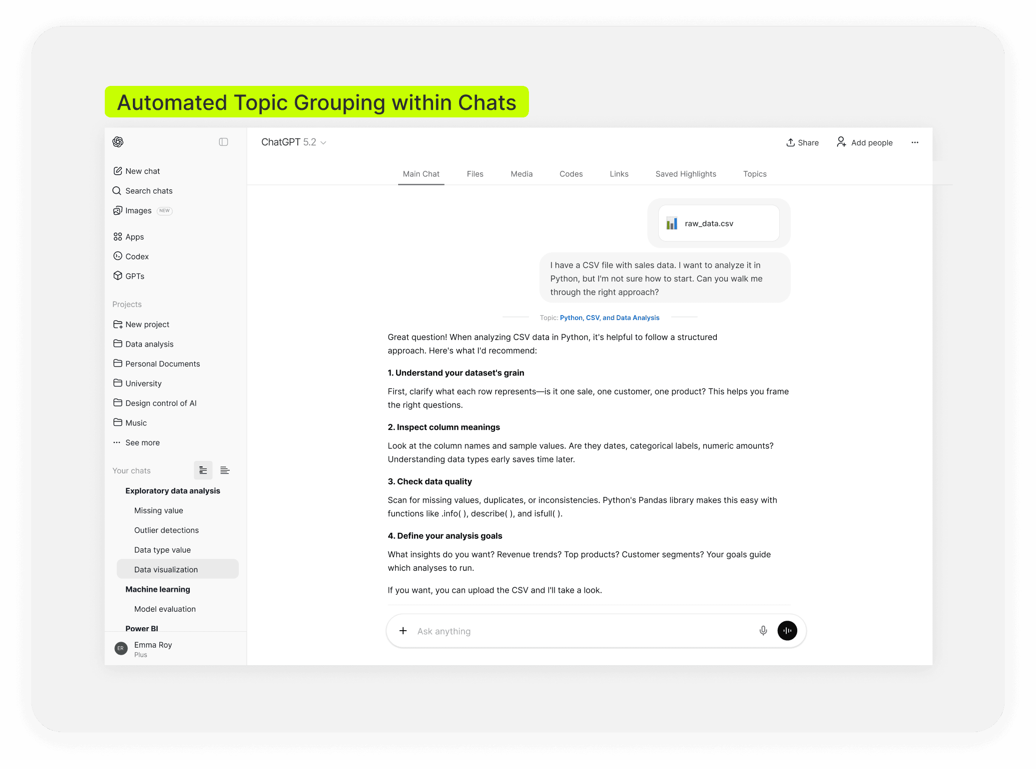 Structure conversations at both the sidebar and in-chat level, so growing history stays easier to scan and manage. This includes AI-assisted chat grouping in the sidebar and automated topic grouping within chats.